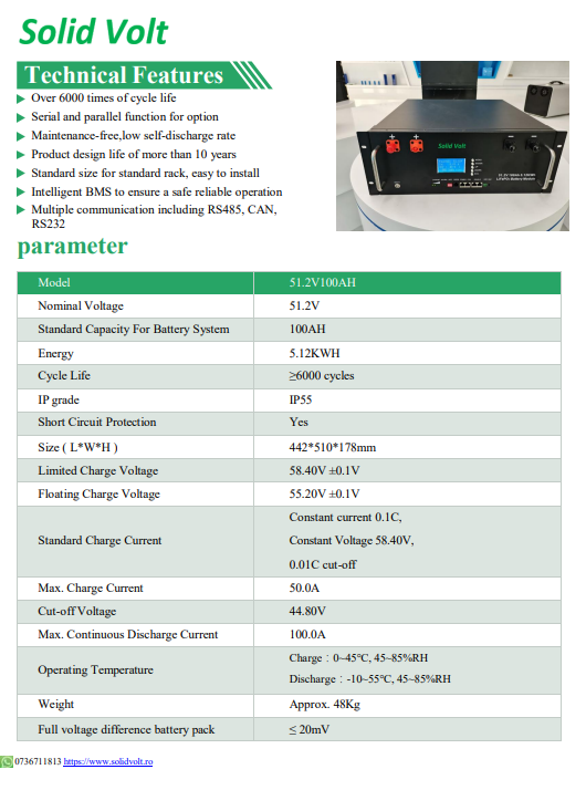 Este una dintre cele mai accesibile baterii LiFePO4 de 5.12 kWh disponibila pe piata din Romania, oferind un raport bun intre pret, performanta si siguranta. Cu o capacitate de 5.12 kWh, acest acumulator Solid Volt reprezinta o solutie accesibila pentru utilizatorii care isi doresc independenta energetica si eficienta buna in cadrul sistemelor fotovoltaice.
