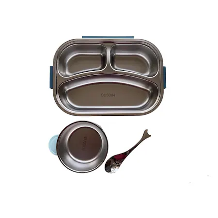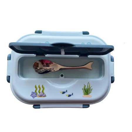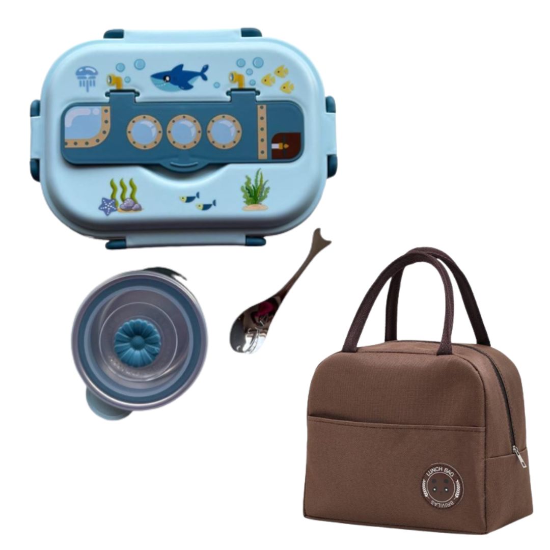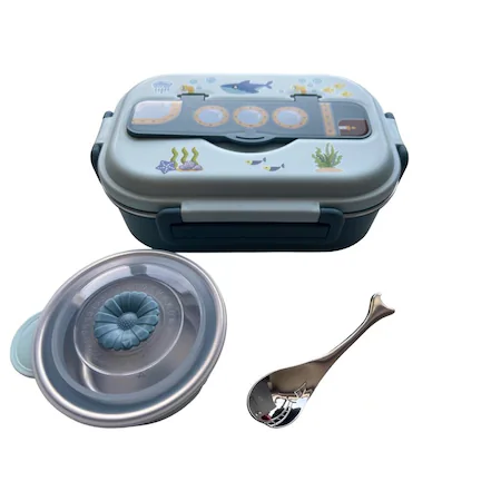 Pachetul contine: caserola compartimentata pentru mancare, bol pentru gustari, lingurita de inox in forma de peste si geanta termoizolanta.