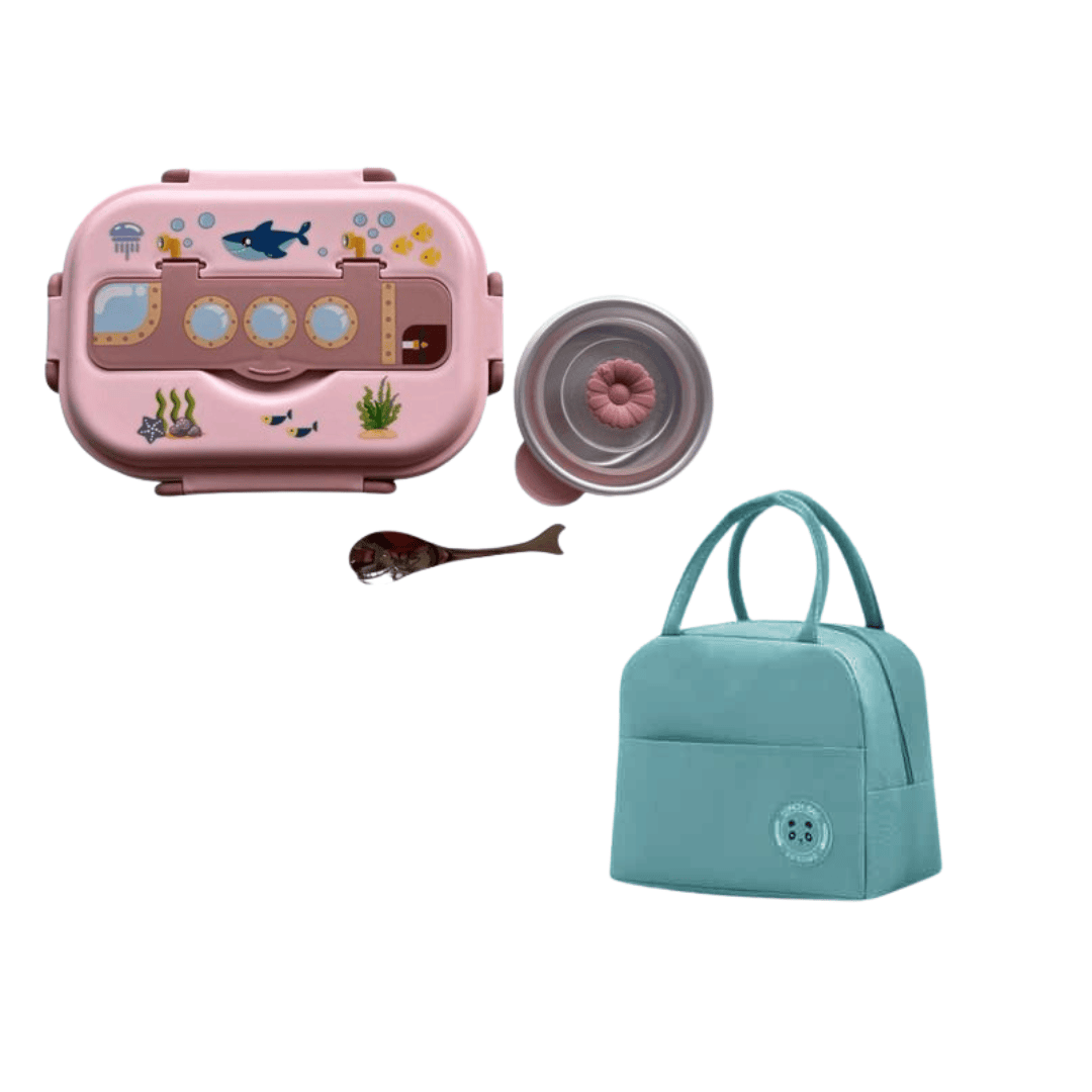Caserola roz compartimentata pentru copii vine la pachet cu geanta termoizolanta neagra, ideala pentru transportul mai usor al mancarii.