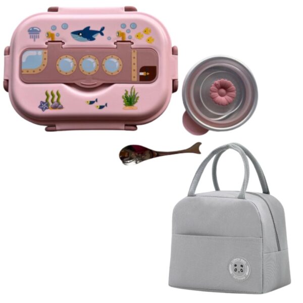 Caserola roz compartimentata pentru copii vine la pachet cu geanta termoizolanta neagra, ideala pentru transportul mai usor al mancarii.