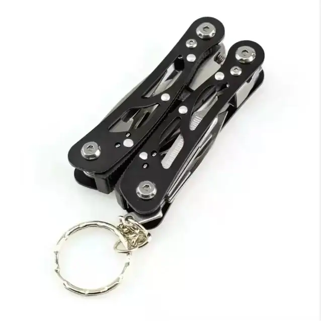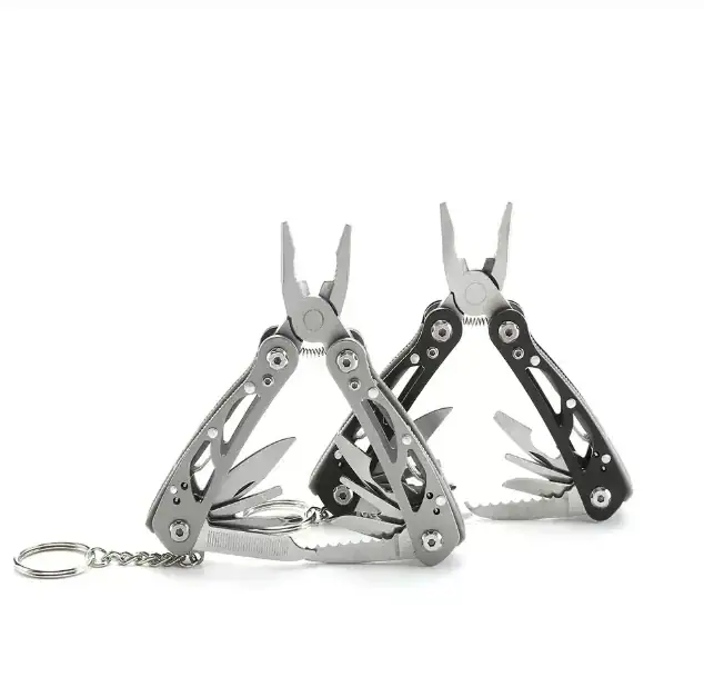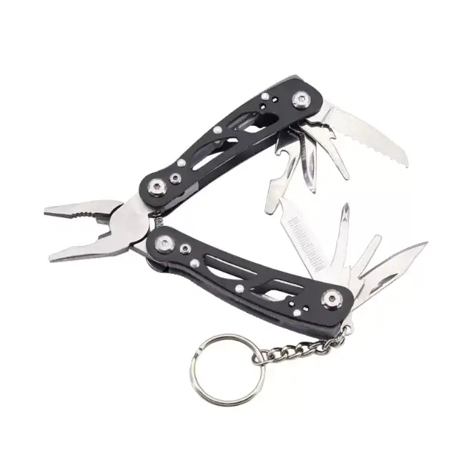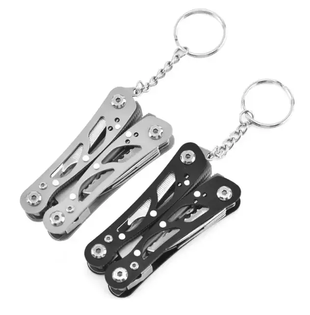 Unelte multifunctionale cu 14 functii, inclusiv capete de cleste (cleste cu beza lunga, cleste cu varf rotund, cleste taiat), cutit ascutit, surubelnita philips, surubelnita cu crestatura(E), cutit zimtat, dispozitiv de indepartare a carligelor, pila cu doua fete, surubelnita cu crestat (L), razuitoare mica, surubelnita cu crestat (M), deschizator de conserve si deschizator de sticle.