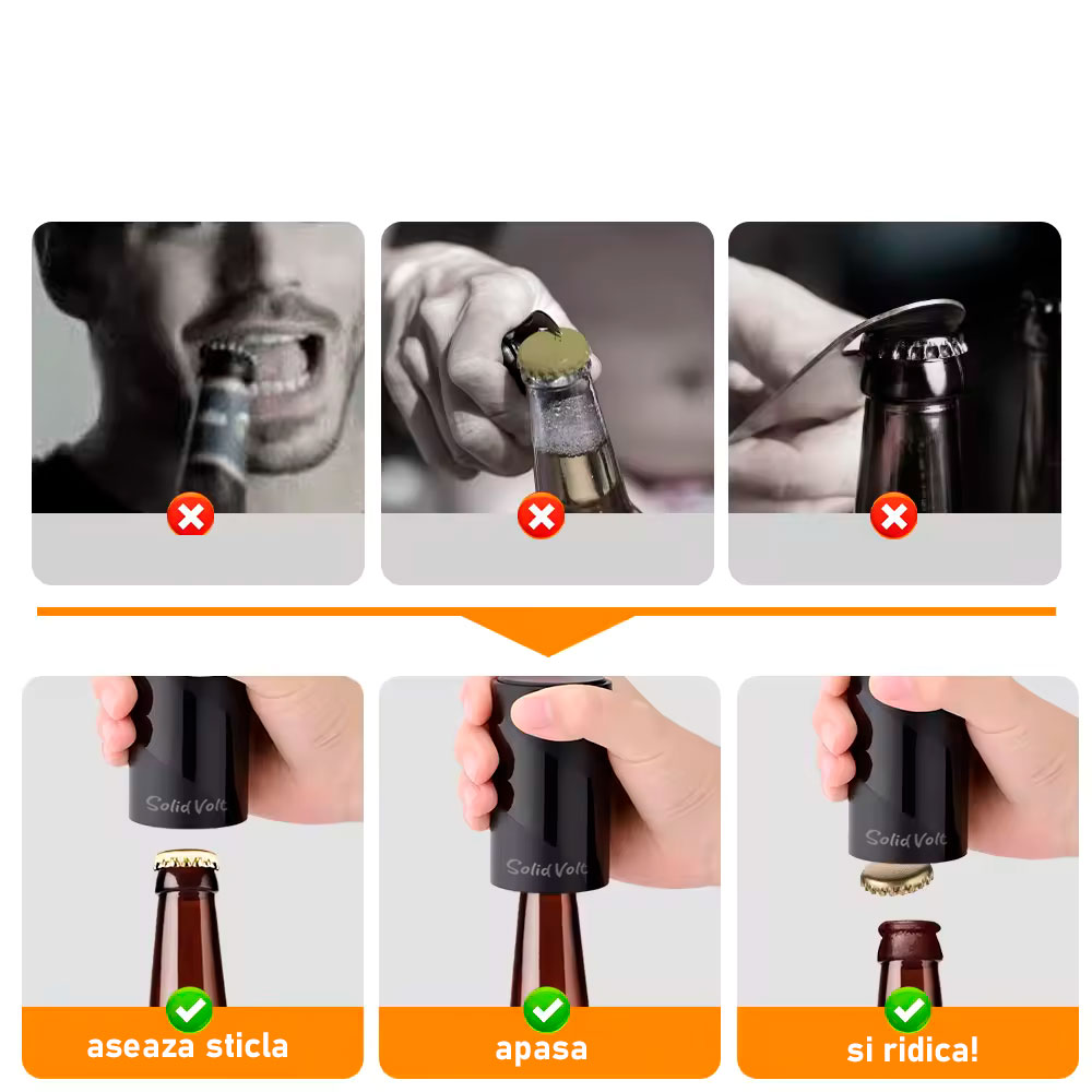 Se apasa peste capacul sticlei pana in capat pentru ca mecanismul sa poata actiona, dupa care se lasa liber iar mecanismul va scoate singur capacul de pe sticla. Cadoul potrivit pentru iubitorii de bere, dimensiunile mici ale produsului il fac usor de purtat oriunde. Confectionat dintr-un material durabil ofera o rezistenta excelenta inclusive in cazul folosirii excesive. Desfacatorul magnetic este potrivit si pentru unii din noi care colectioneaza capace datorita faptului ca modul de desfacere nu indoaie si nu afecteaza capacul in niciun fell.