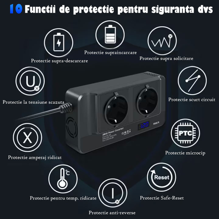 Incarcare multifunctionala, inteligenta: convertorul de tensiune 12 V 220 V / 230 V cu 4 porturi de incarcare USB si 2 prize AC va poate satisface toate nevoile si va permite sa va incarcati smartphone-ul, laptopul, camera foto, aparatul de ras electric sau alte dispozitive electronice in timpul calatoriei. Acest invertor auto are 6 functii de protectie, inclusiv protectie la inalta tensiune, protectie la scurtcircuit, protectie la suprasarcina, protectie la subtensiune, protectie la supracurent si protectie la temperatura ridicata.