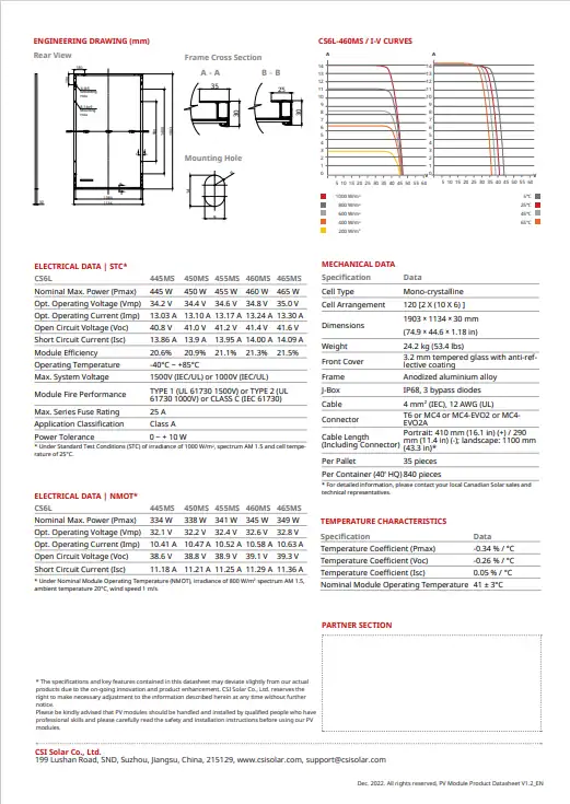 CS6L-455MS este un panou solar de la Canadian Solar dotat cu celule monocristaline, care ofera un nivel ridicat de eficienta energeticaMai subtire, mai compact si fara sacrificii, CS6L-455MS prezinta un avantaj fata de alte panouri solare avand dimensiunile de doar 1903 x 1134 x 30 mm, generand o putere de 455W cu o tensiune de operare de 34.6 V si un curent de operare de 13.17 A. Tensiunea circuitului deschis este de 41.2 V, in timp ce curentul de scurtcircuit este de 13.95 A.