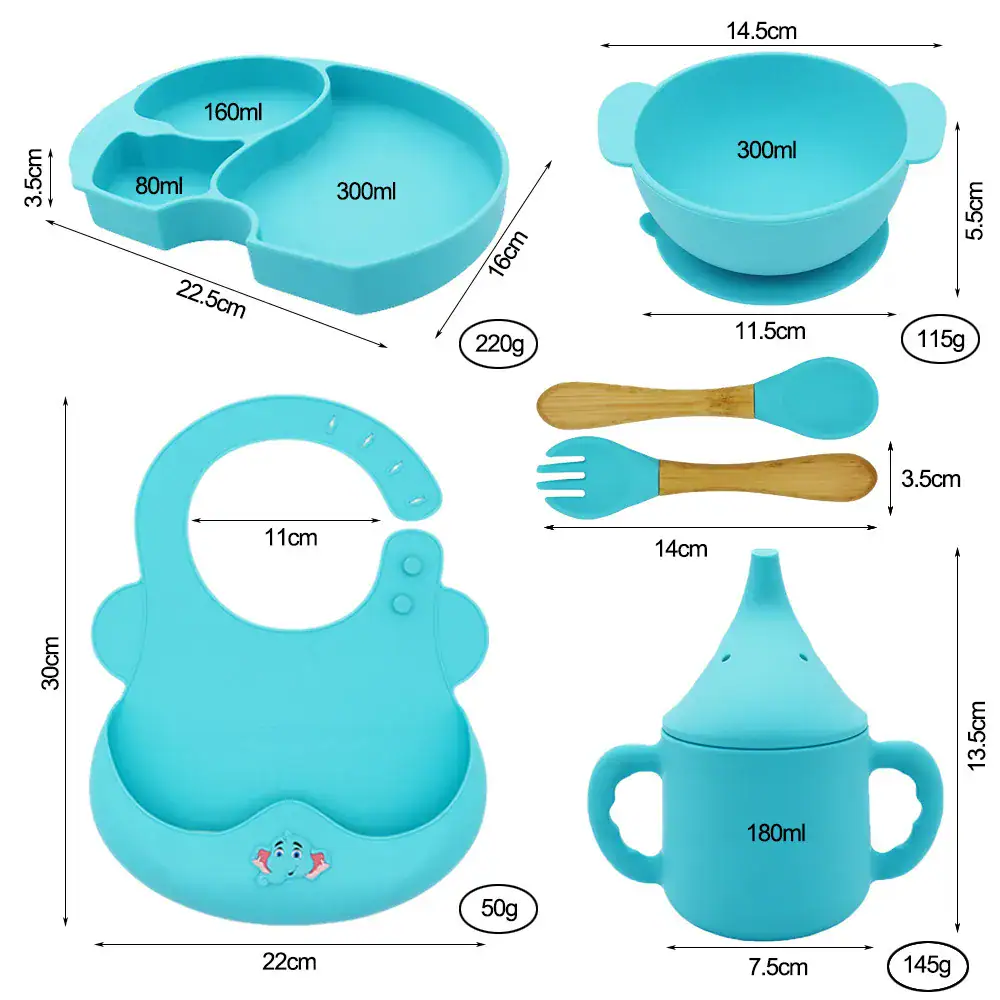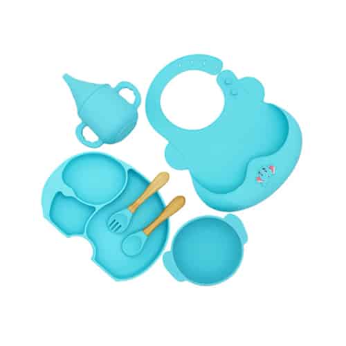 Set din silicon anti-alunecare pentru bebelusi, compus din farfurie, bol, furculita, lingurita, baveta si pahar cu cioc.